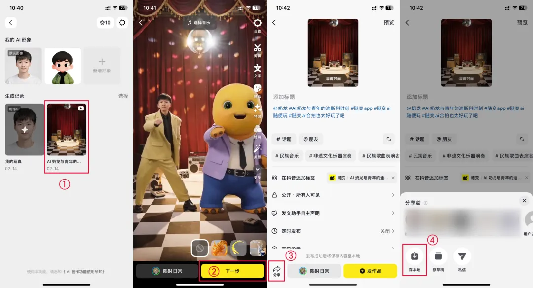 直接点开生成的视频,然后点击下一步,接着点击左下角的分享按钮,在弹出的弹窗中点击存本地,这条视频就能成功下载保存到我们的手机相册里。