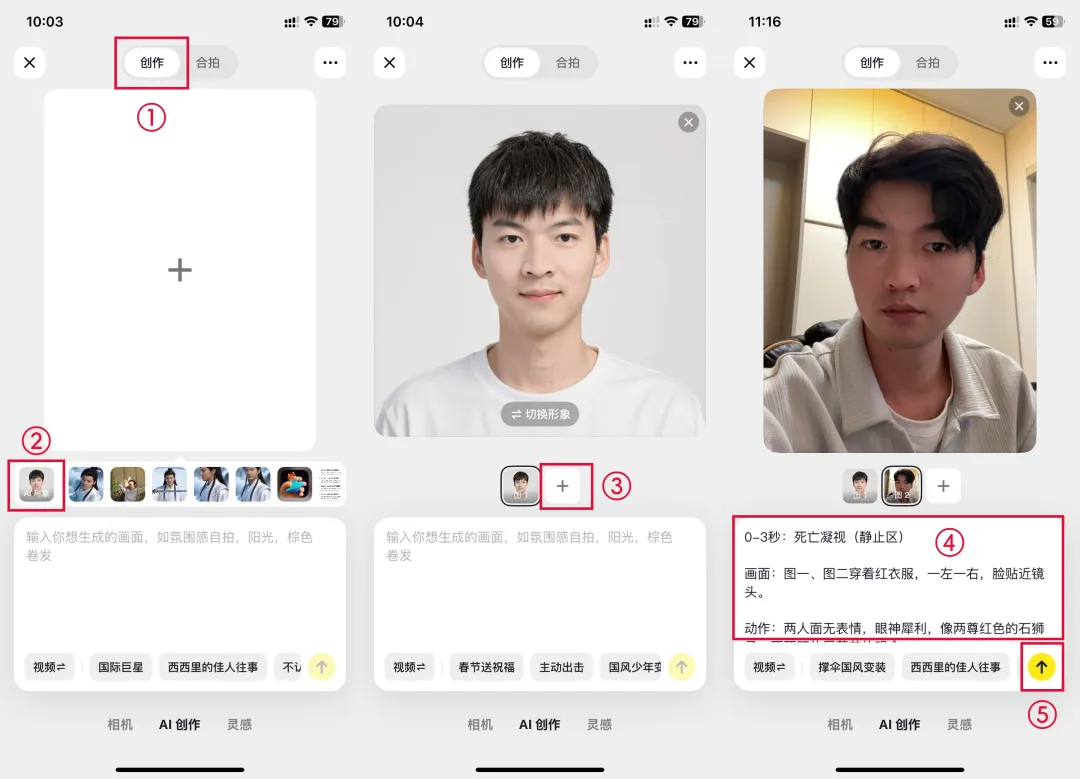 先来看看合拍的玩法,其实就是@不同形象生成一些合拍视频,输入框内可以输入@来选择不同的形象,输入框下面还有一些预设好的玩法,点击会自动帮你把提示词填充到输入框内。