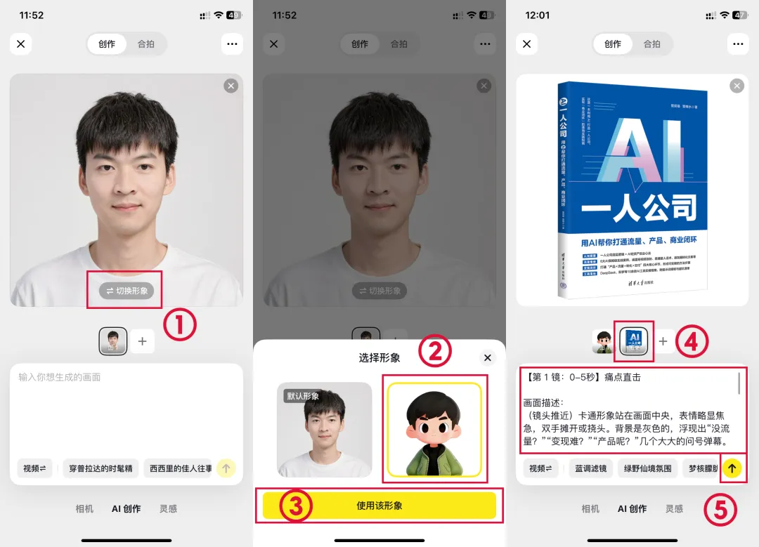 我这里随手上传了我们的新书《AI一人公司》书籍图片上去,然后输入了一段AI生成的提示词。点击发送,它就能用我的虚拟形象来生成一条带书视频。
