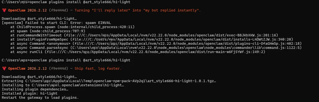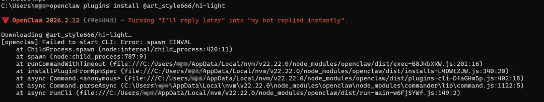 全网好像都没有解法,这是因为openclaw里的 npm.cmd 没启用 Shell 模式,参数里边的 @ 会被认为非法格式。