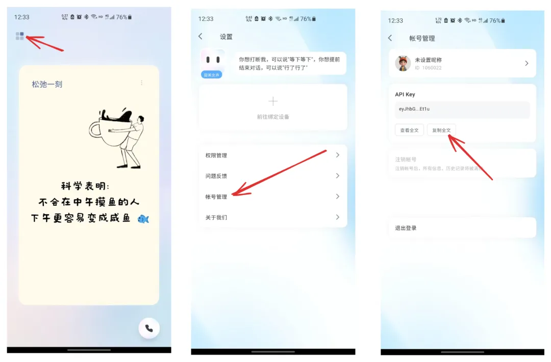 打开APP后,进入设置 → 帐号管理 → 获取API KEY。