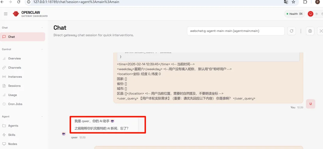 它说它叫qwer,没错,这就是我给我龙虾起的名字。