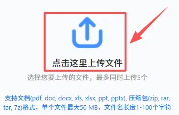 2、点击“上传”按钮,支持PDF、Word(.doc/.docx)、Excel(.xls/.xlsx)、PPT(.ppt/.pptx)、ZIP/RAR压缩包等格式,单文件最高支持100MB。
