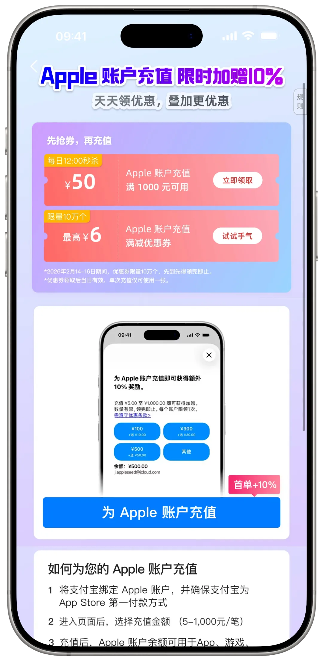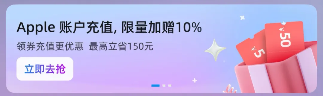 如果你的付款方式是支付宝的话还可以去支付宝搜索Apple 专区里面领取充值满减优惠券,几毛几块不嫌多。