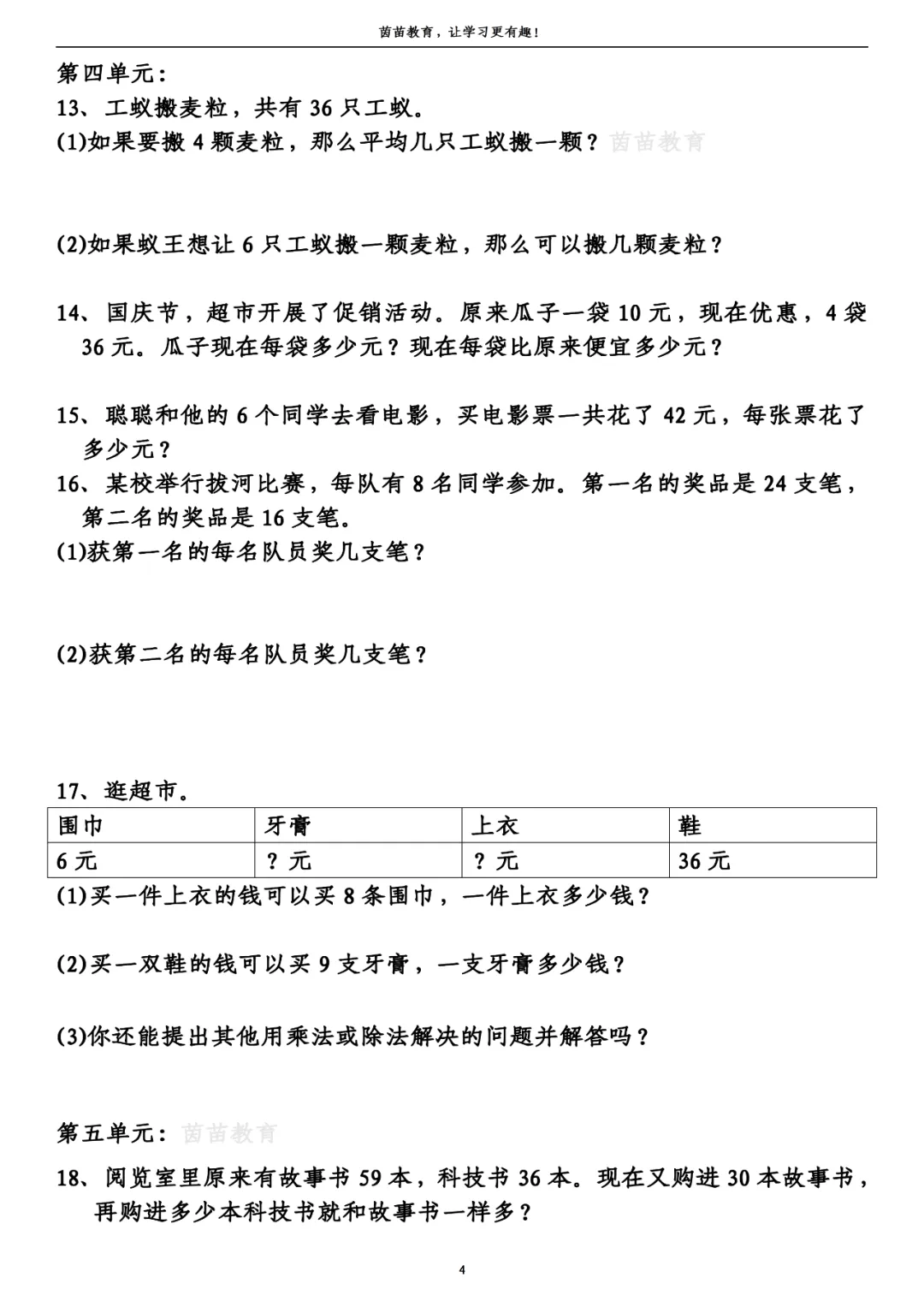 13、(1)36÷4=9(只) (2)36÷6=6(颗)