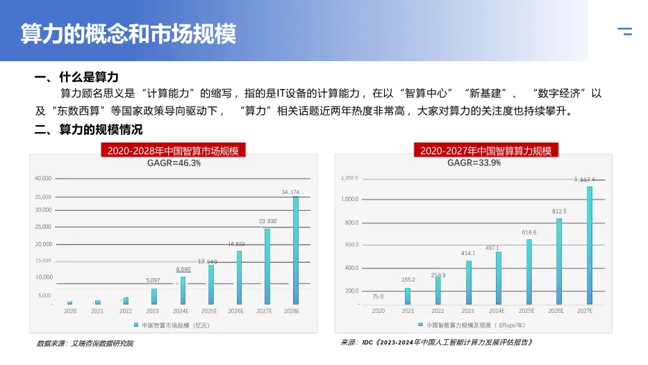 算力作为IT设备的核心计算能力,在“智算中心”“东数西算”等国家政策驱动下,已成为数字经济发展的核心支柱,市场规模持续高速增长。2020-2028年中国智算市场GAGR达46.3%,2027年智能算力规模预计突破1117.4 EFlops/年,展现出强劲的增长势能。