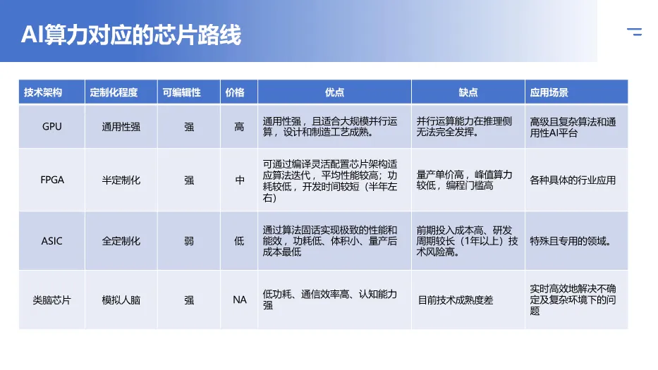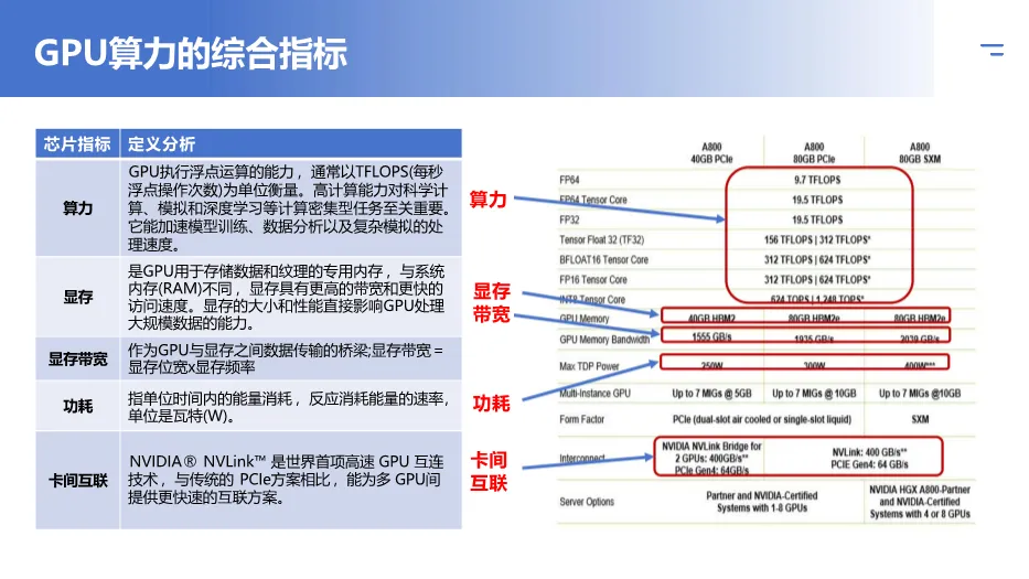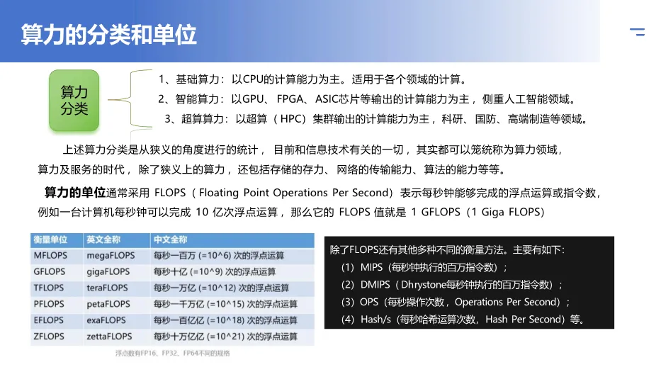 算力主要分为基础算力、智能算力和超算算力三类,分别适配通用计算、人工智能及高端科研等场景,其衡量单位以FLOPS为核心,涵盖从MFLOPS到ZFLOPS的多层级精度标准。其中,智能算力以GPU、FPGA等芯片为核心,成为AI时代的关键支撑,而GPU凭借强大的并行运算能力,主导了大规模模型训练与推理场景。