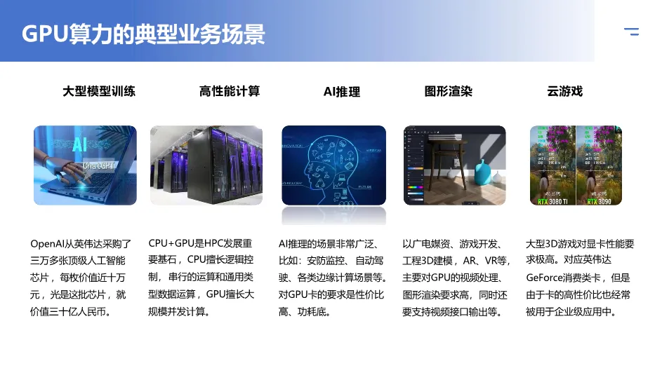 AI服务器作为算力的核心载体,按应用场景可分为训练型和推理型,前者侧重高密部署与强算力,后者强调低时延与高弹性。随着技术演进,GPU服务器与标准服务器在硬件配置、功耗、应用场景等方面形成显著差异,NVLink互联技术的应用进一步提升了多GPU协同效率,满足大模型训练的高带宽需求。当前,算力产业正呈现出技术迭代加速、国产芯片崛起、应用场景多元化的发展趋势,为各行业数字化转型提供坚实支撑。