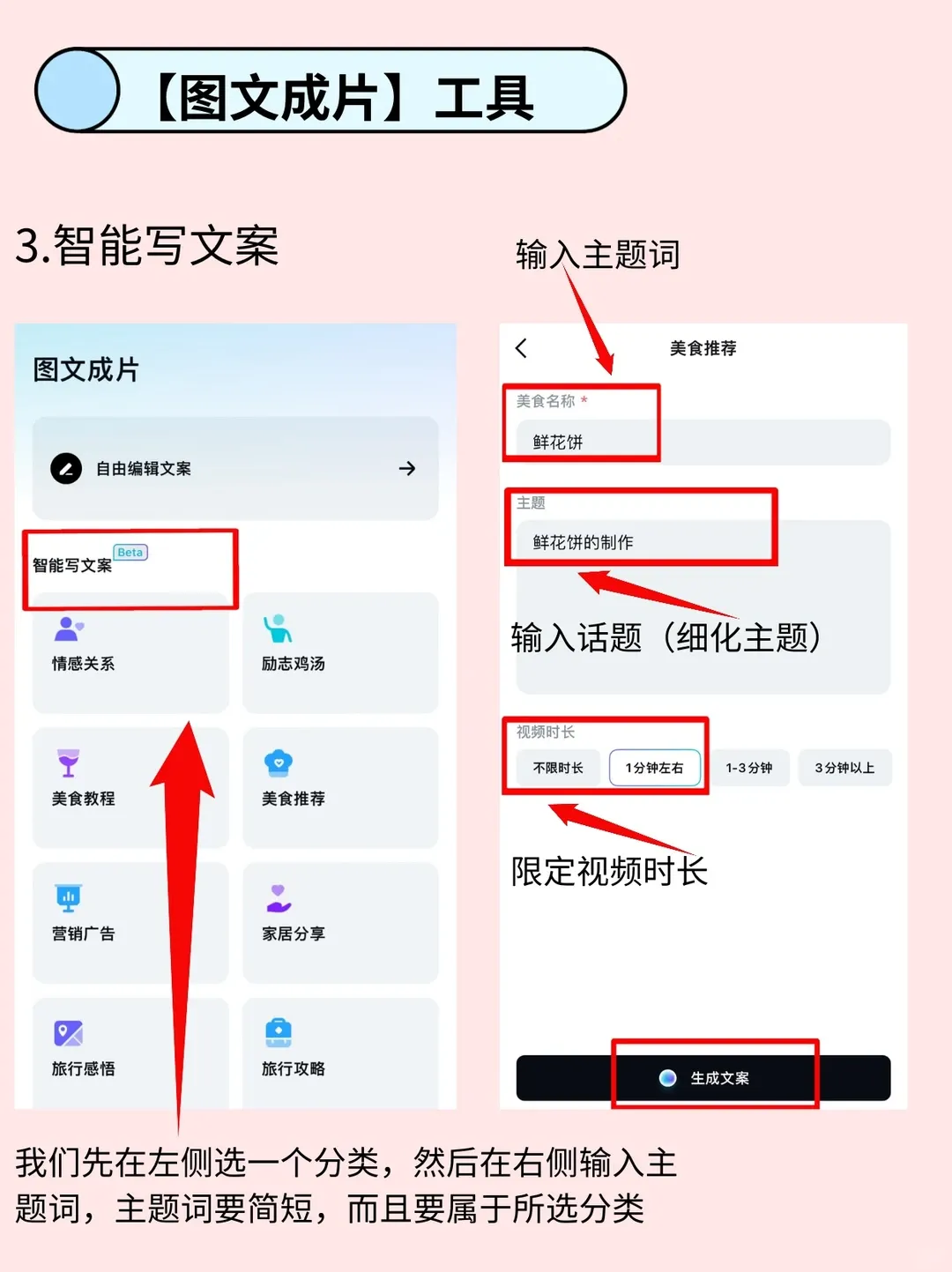 首先,你需要选择一个内容分类,比如情感、科普、美食或生活记录,确保生成的文案风格精准。接着,在界面输入简短且精准的主题词,注意主题词要贴合所选分类。随后,系统会引导你将主题细化成具体话题,并让你选择生成视频的预期长度。设置完毕后,点击【生成文案】,AI就会迅速生成多套高质量的文案供你挑选。