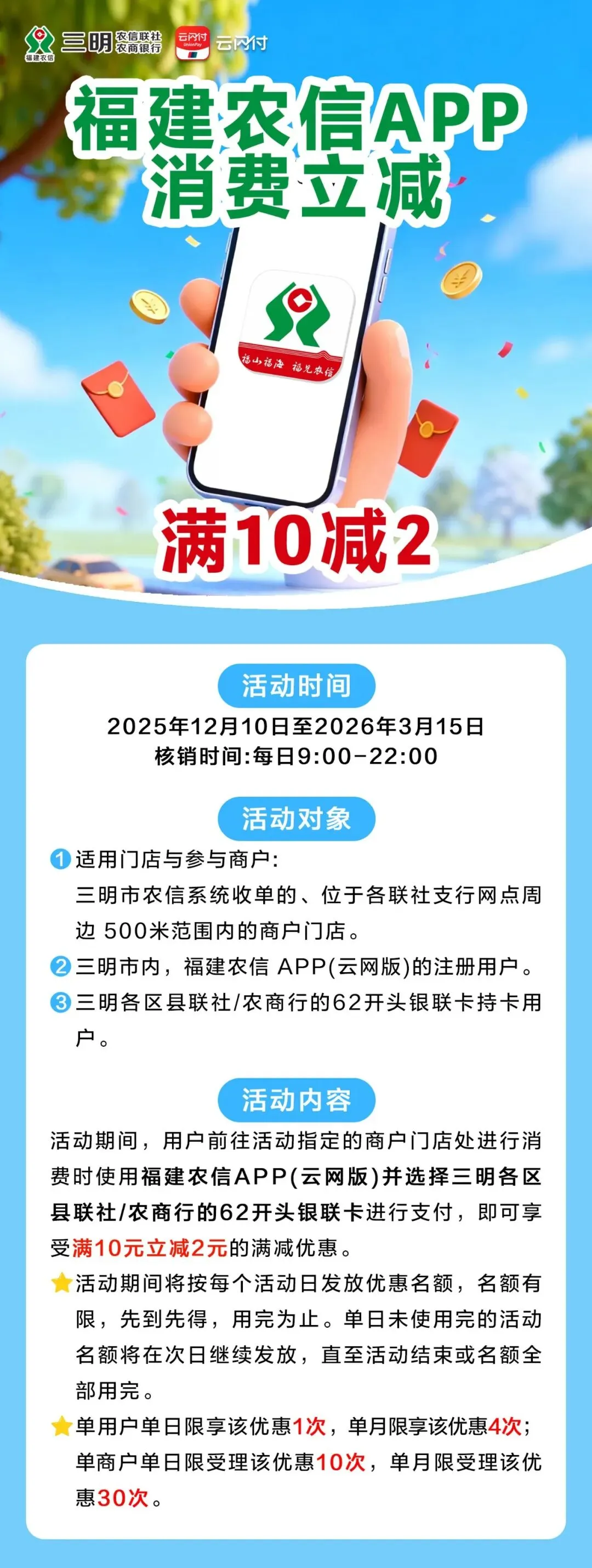 满10减2!三明人注意,福建农信APP消费立减福利来了!