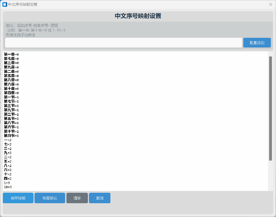 按照「序号=层级」的格式填写,一行仅填写一组对应关系(示例:第一章=0、第一节=1、一、=2);