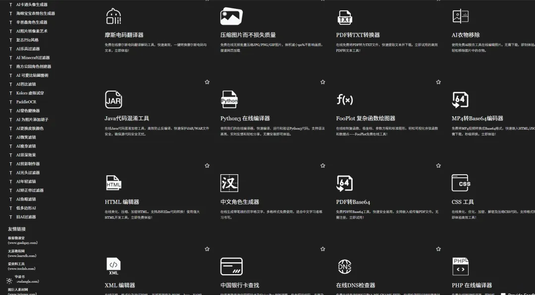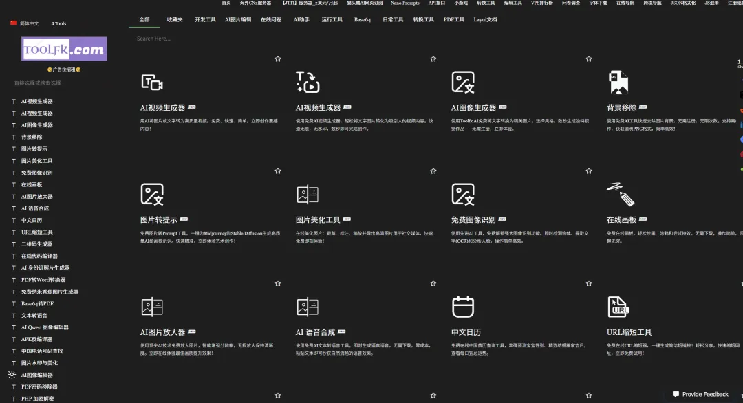 ToolFK包含了代码处理、格式转换、加密解密、网络工具、AI赋能的工具集,如AI文案生成、AI战略决策分析等。