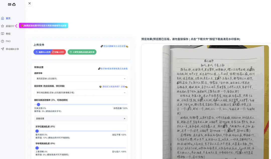 支持将Word、PDF等电子文档一键转换为逼真手写稿图片,模拟真实书写行为,包括笔迹、涂改痕迹、文字凌乱度等细节