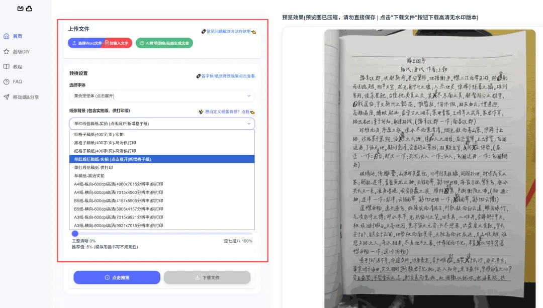 提供多种手写字体、纸张背景,如红线信纸、普通稿纸、涂改率(0%-100%)、行间距波动等参数调整,满足不同场景需求。