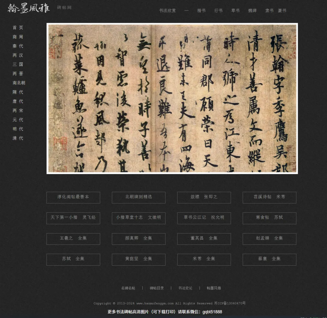 翰墨风雅是一款免费的书法学习综合性软件,汇集了从晋代到当代的海量极品书画资料,包括高清字帖、拓本等,图片清晰无暇,色彩准确,绢丝可见