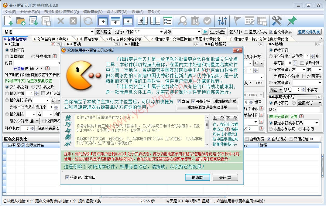 菲菲更名宝贝是一款优秀的批量更名软件和批量文件处理工具。软件以功能强大著称,在国内文件处理和批量更名类软件中占有一定地位。新版本『得意非凡』系列拥有全新的界面,一目了然的功能,以及更快的处理速度,更贴心的帮助和提示系统,比前作功能更加强大、操作更加便捷。软件属于免费软件,没有任何广告或功能限制,无需安装和额外文件支持直接使用,是一款精致而不可多得的绿色单文件工具,让你爱不释手,值得珍藏和推荐。