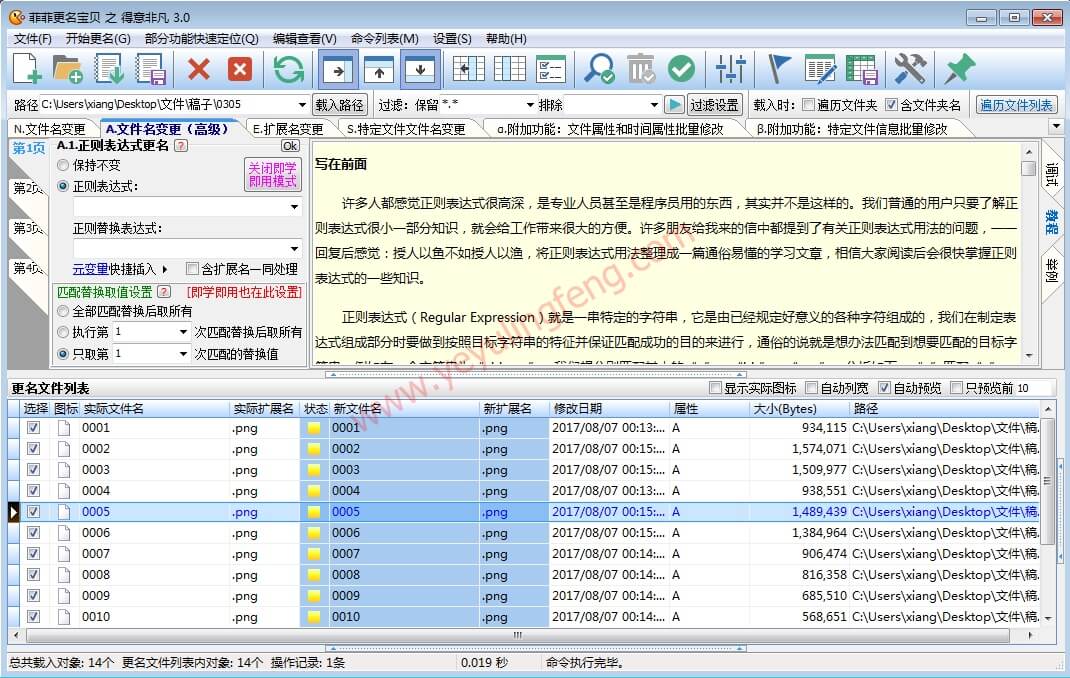 上次老夜在ReNamer Pro文件批量重命名绿色便携版一文中为大家介绍了一款简单易上手的批量文件重命名软件,由于操作过于简单有部分小伙伴看不上,这次就为大家分享个更专业点的实用工具,确实很专业,专业到老夜现在还没玩明白。软件名取得很随意大家也不要在意细节,功能强大就够了,使用此工具有一定的门槛,需要了解一些正则表达式相关的知识,大家也无需百度,作者已经在软件内附上了近千字的使用说明!鼓掌(啪!啪!啪!)~