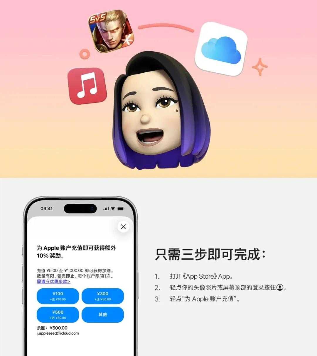 优惠仅适用于中国大陆范围内,优惠有效期间,向 Apple 账户进行的首笔符合条件的充值订单。