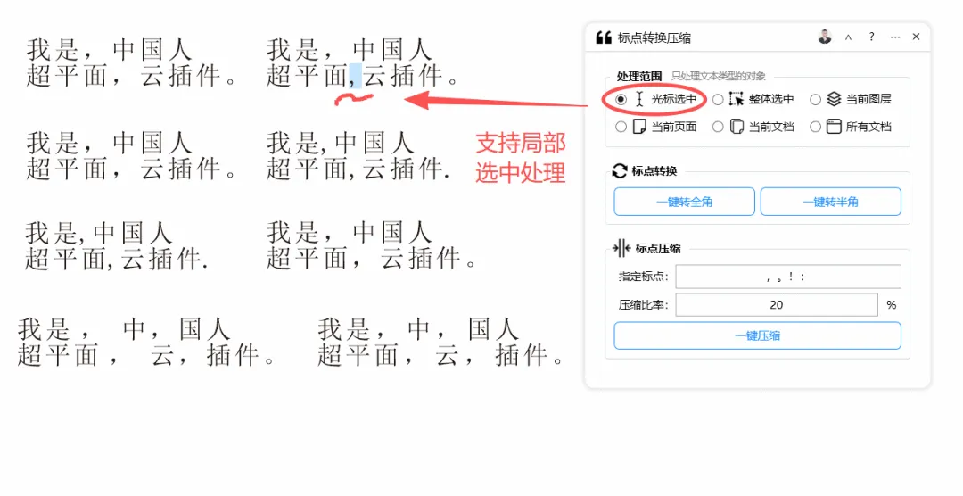 功能简介:该插件可实现将文字中的标点符号转换为全角、半角标点符号、对标点符号进行压缩,可一键处理当前文档所有页面中的文本,包括群组、图框内部的文本对象。
