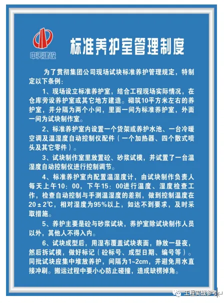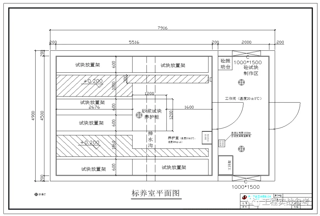 标准养护室分内外二间,内间为养护室,外间为制作室。养护室不设窗,内部照明采用防潮灯具,地面为水泥砂浆,设排水沟。