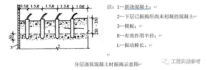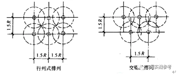 ⑤振动器插点应排列均匀,可采用“行列式” 或“交错式”,按顺序移动,不应混用,以免造成混乱而发生漏振。每次移动位置的距离应不大于振动器作用半径(R)的1.5倍。振动棒的作用半径(通常为振动棒半径的8~10倍)一般为300~400mm。见下图。