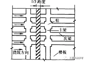4) 有主、次梁的楼板, 宜顺着次梁方向浇筑, 在保证主梁浇筑的情况下,垂直施工缝可留置在次梁跨度的中间1/3范围内,详见下图: