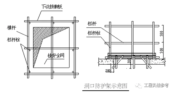 1 150×150cm以上的洞口,四周必须搭设围护架,并设双道防护栏杆,洞口中间支挂水平安全网,网的四周要挂牢固、严密。(见下图)