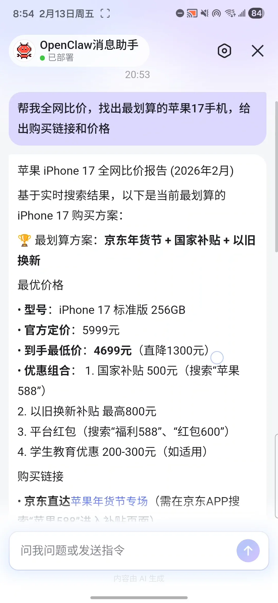 2 月 14 日,百度 App 正式支持一键调用 OpenClaw 智能体工具,用户在百度智能云完成部署后,通过搜索框或消息中心即可调用。