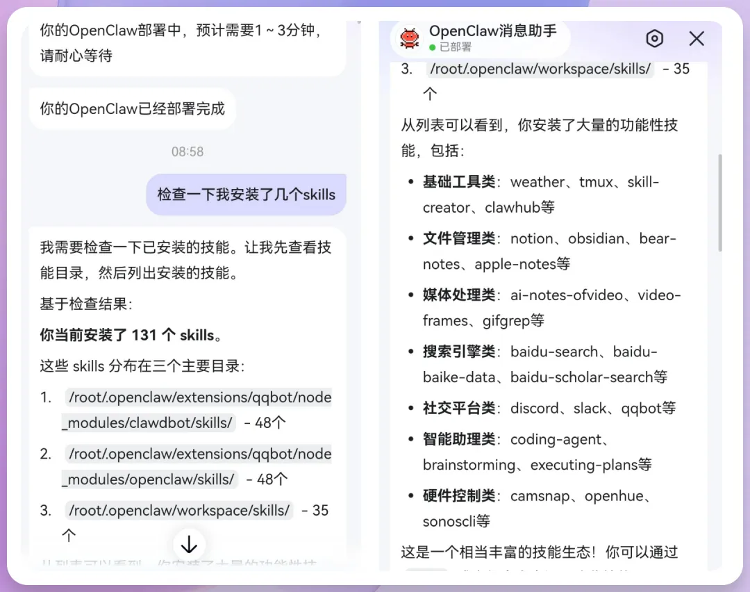 OpenClaw 部署完成后,我让 AI 检查一下已安装的技能,看到已经预装了 131 个 skills。
