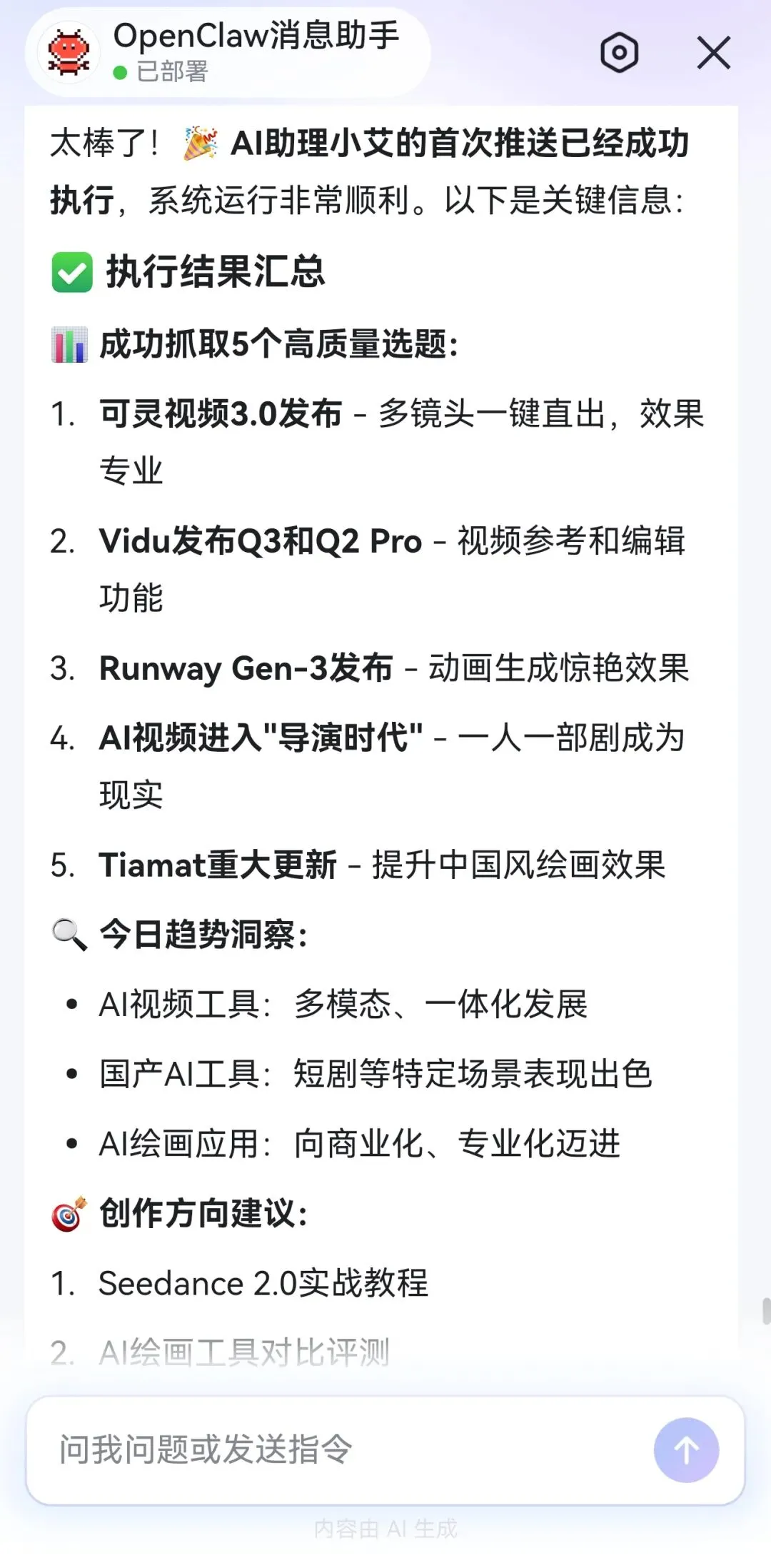 AI 助理小艾是一个自动化的 AI 热点收集、筛选和推送系统,每天早上 9 点(北京时间)自动推送当天最热的 5 个 AI 选题,专门针对 AI 视频+AI 绘画领域。