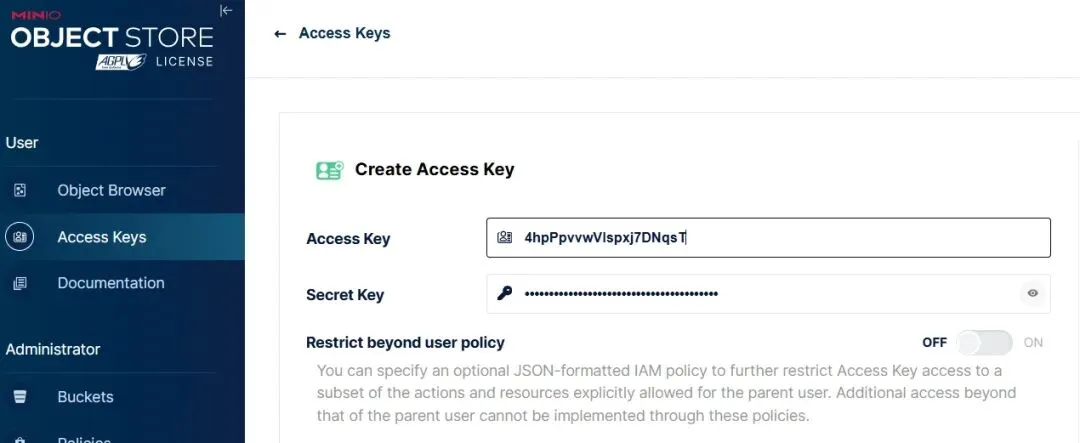 Docker 启动的 MinIO 默认密钥可能与配置不一致,建议手动创建或同步: