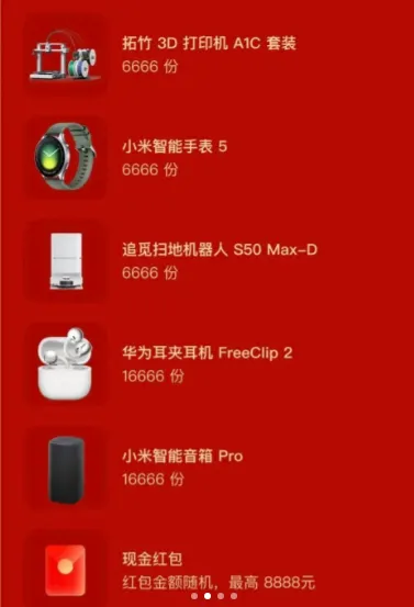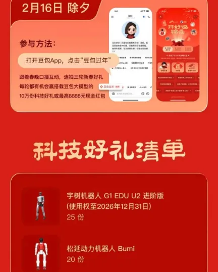 豆包春节红包活动的最大亮点是科技实物奖品。与腾讯元宝的10亿纯现金、阿里千问的30亿消费免单不同,豆包将相当一部分奖励额度投入到实体科技产品中,让用户不仅获得现金红包,还能体验AI技术如何融入日常生活。