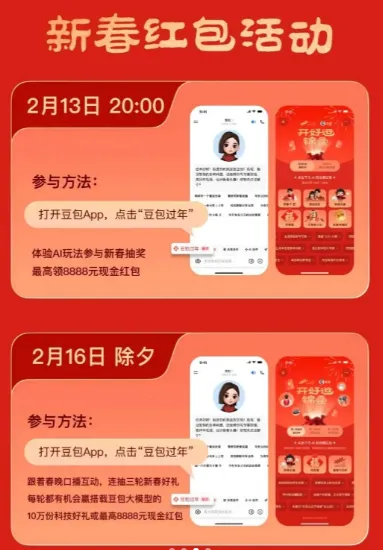 豆包APP的”豆包过年”新春活动分为两个主要阶段,每个阶段都有不同的参与方式和奖品设置: