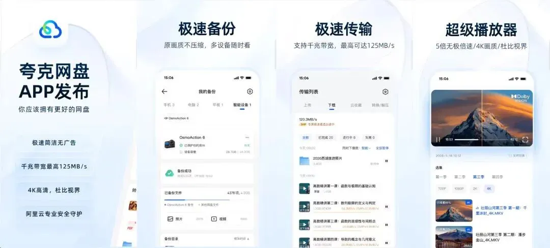 作为网盘核心的播放功能,夸克网盘也拉满了体验:支持 4K 高清 + 杜比视界,搭配 5 倍无极倍速,还有清晰人声、超重低音等多种音效可选,追剧看片的沉浸感直接拉满。再加上阿里云专业安全守护,多重加密存储,文件安全也让人放心。