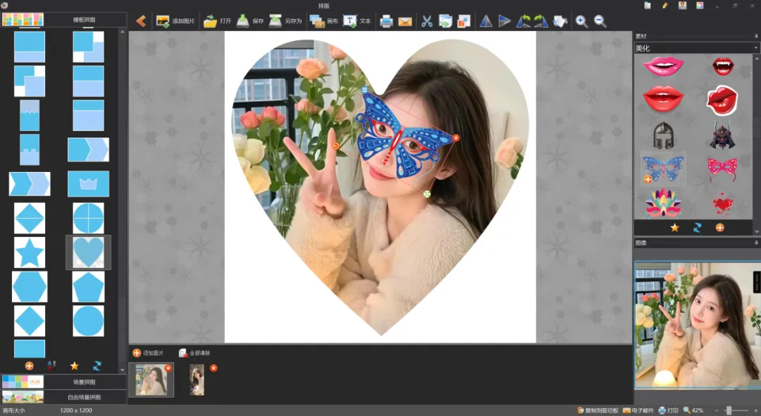 特别值得一提的是,它的版面设计功能。你知道吗,很多网站的版面设计功能是需要收费的,而“图片工厂”提供了多种免费的模板,右侧还可以加一些搞笑或者创意的小效果,比如眼镜、吻痕等,简直是为图片加分的好帮手。
