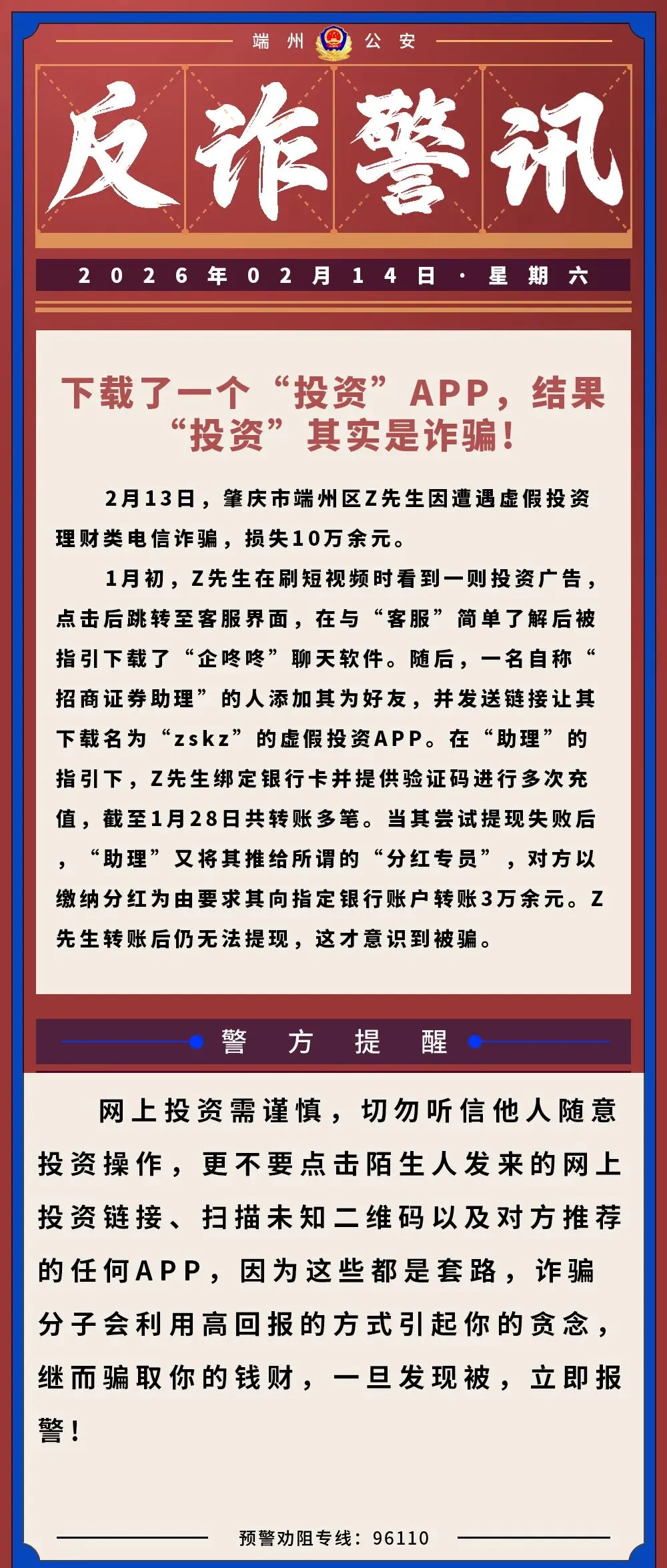 【端州反诈警讯】下载了一个“投资”APP,结果“投资”其实是诈骗!