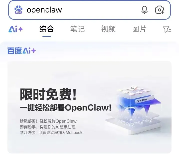 手机下载安装登录百度APP,首页顶部搜索Openclaw,出现如图所示。