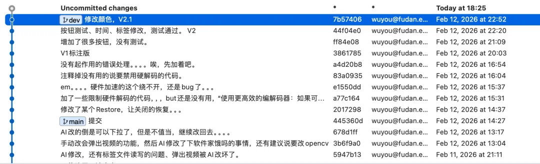 然后AI干活到一定的瓶颈,比如标签的设定的时候,我就进VSCode直接看文件和改了(示意图下个案例放)。下图这么多Git提交,大部分是我调BUG时候开始担心AI乱改,各种紧急存档版本。
