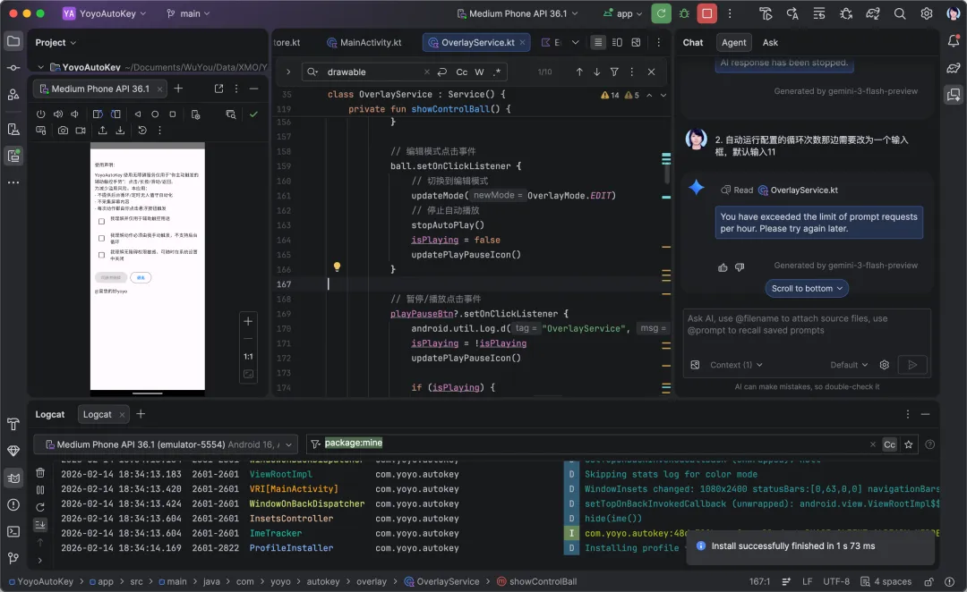 图源:Android Studio里打开AI修改的代码,左边是手机模拟,我是AI的无情的编译、测试和报错助手