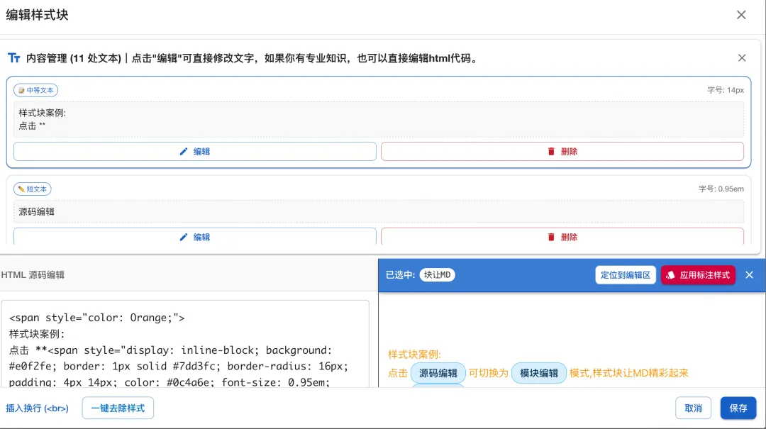 点击左侧后弹起单独弹窗可以二次编辑【右侧预览区可以继续选中文字增加局部样式】
