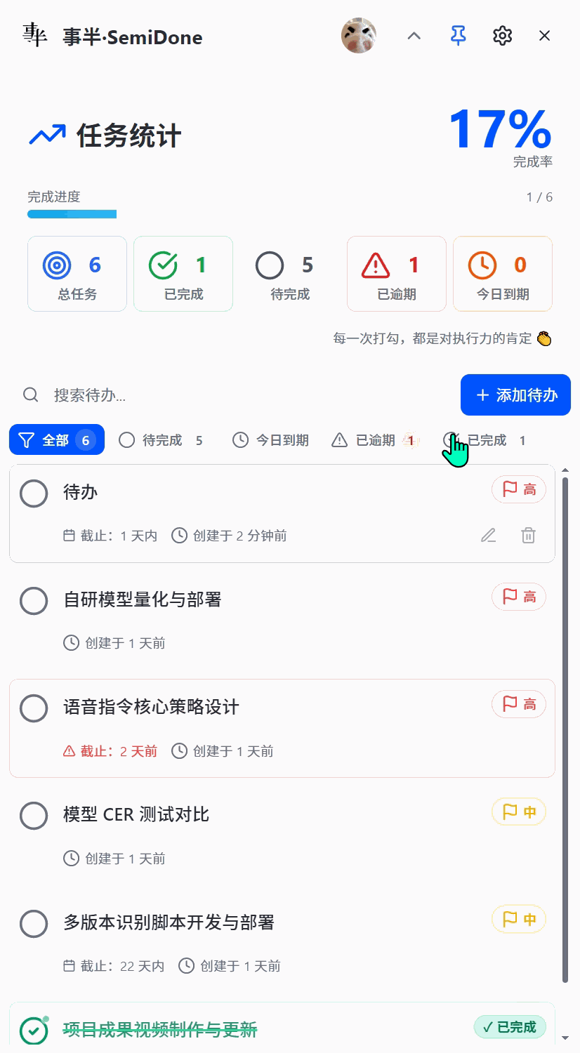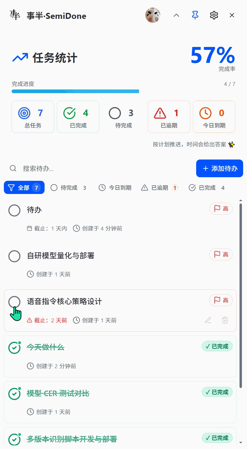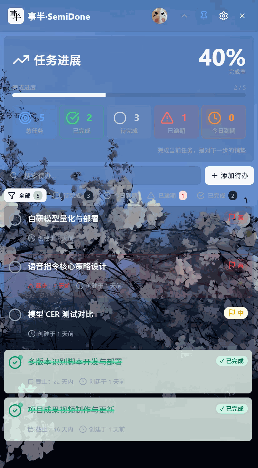 事半·SemiDone,一个 Windows 桌面待办应用。名字取自「事半功倍」,SemiDone 是 Semi + Done 的组合,意思差不多。