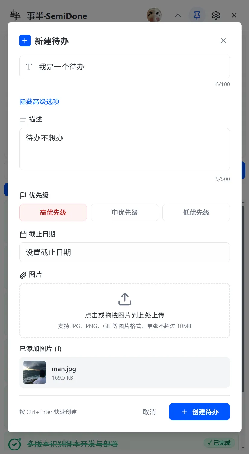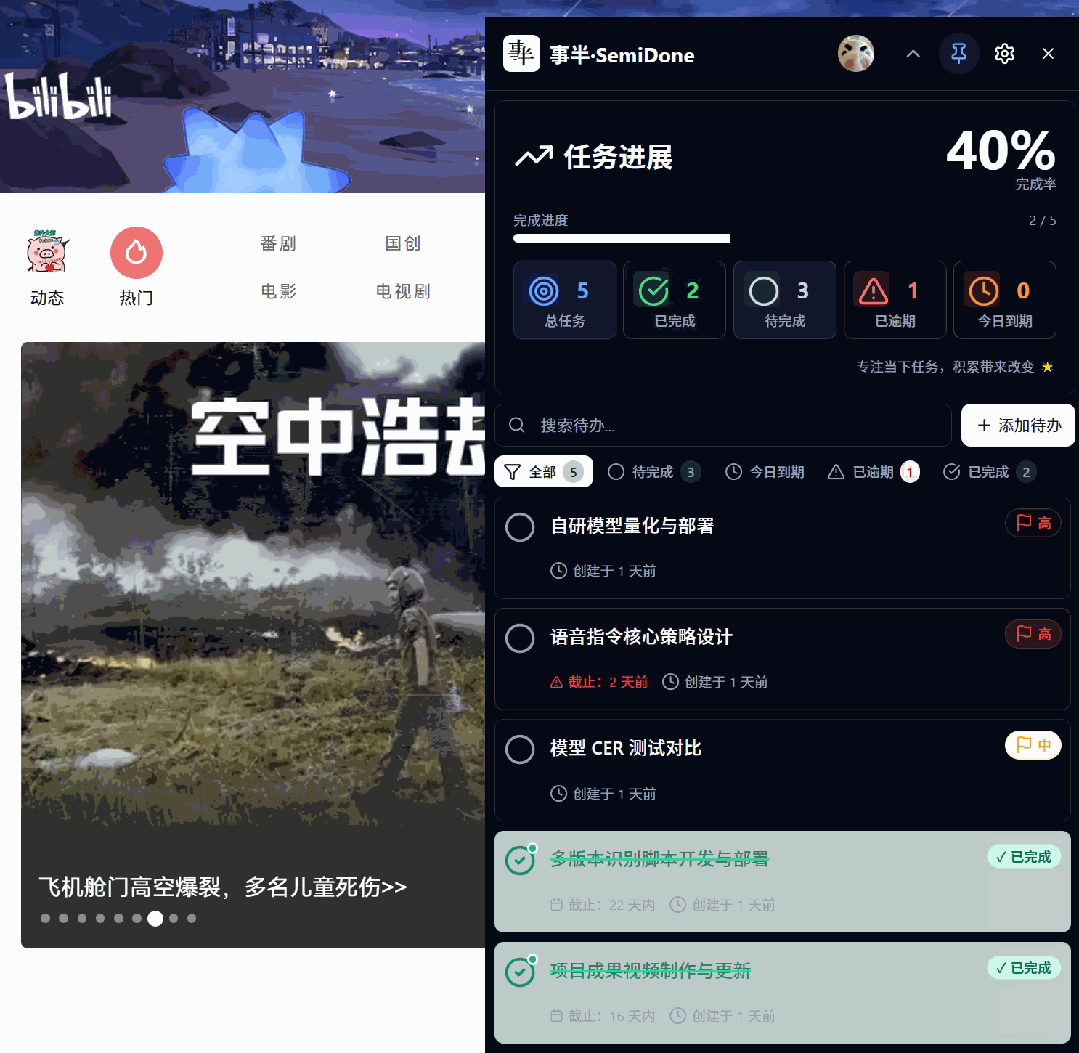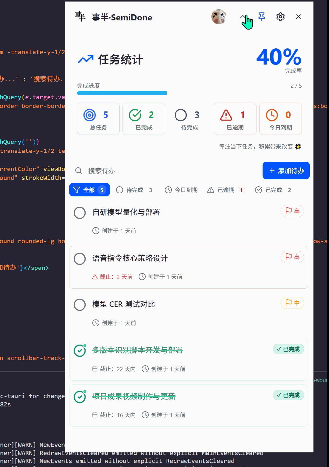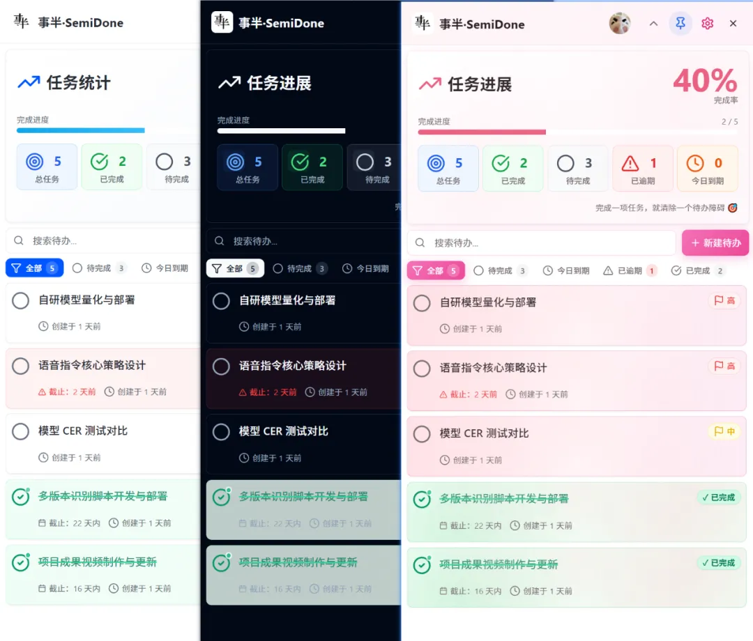 事半·SemiDone,一个 Windows 桌面待办应用。名字取自「事半功倍」,SemiDone 是 Semi + Done 的组合,意思差不多。