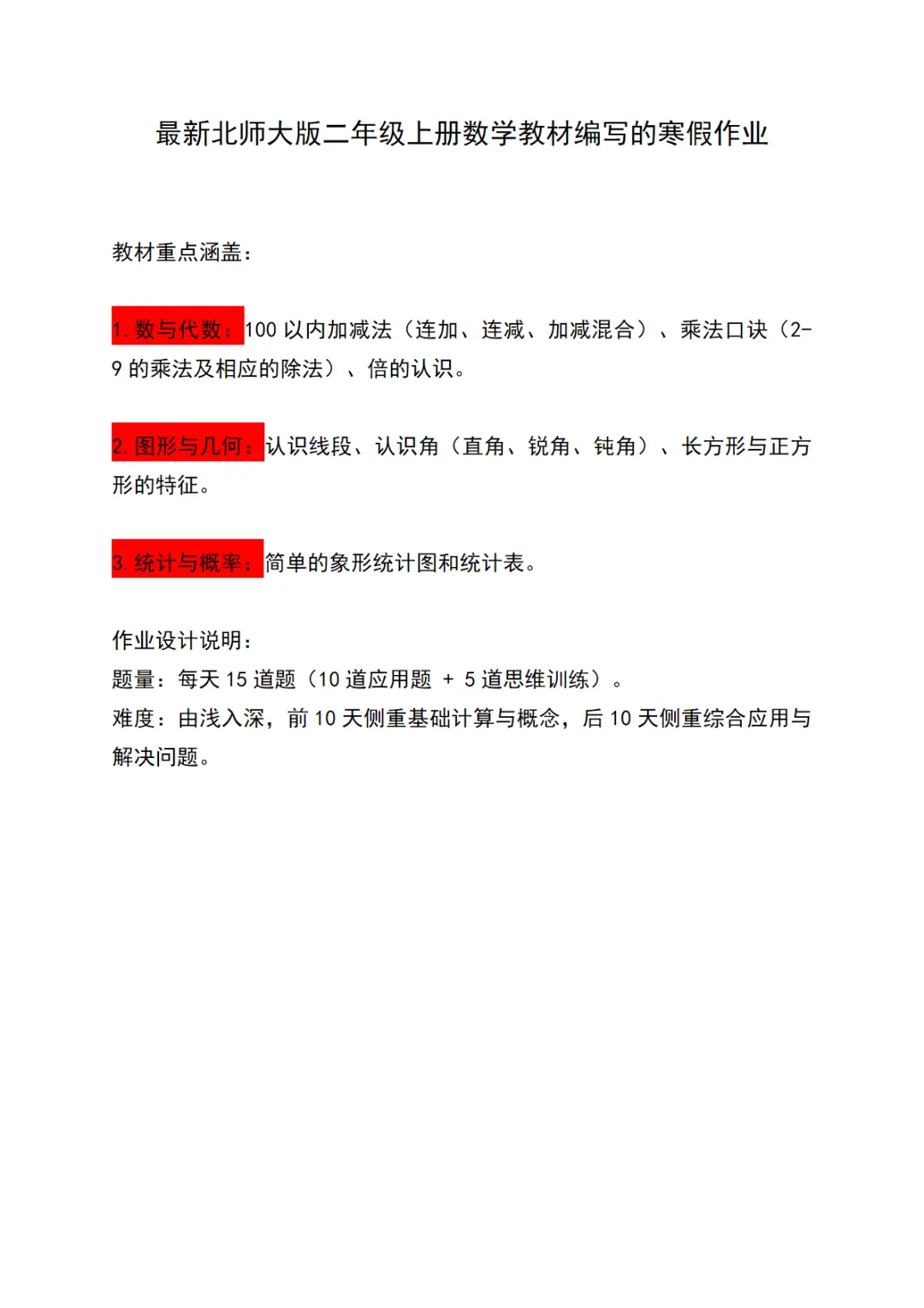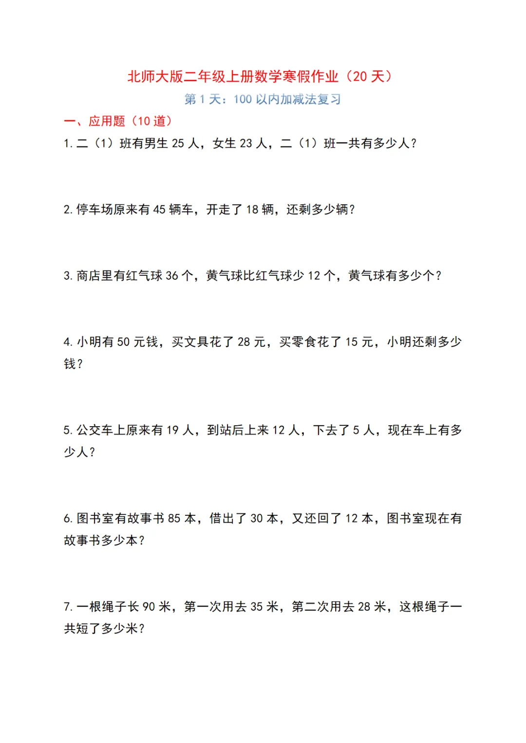 【免费下载】二年级(上)数学 寒假作业20天《北师版》,PDF电子版,共56页,可打印