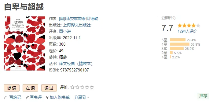《自卑与超越》pdf+epub+mobi+azw3电子书免费下载 《自卑与超越》电子版下载链接,点击文章末尾左下方“阅读原文”自动跳转。 代找电子书加微:350775395,加微备注领取电子资料可免费领取20T电子资料合集(古籍/电子书/小说/游戏/软件工具/电影/电视剧/动漫/PPT素材/教辅资料/烹饪教程/各类学习文档等电子资源)。 特别提醒:电子资料仅供个人学习使用,链接随时失效,请及时保存到个人网盘!