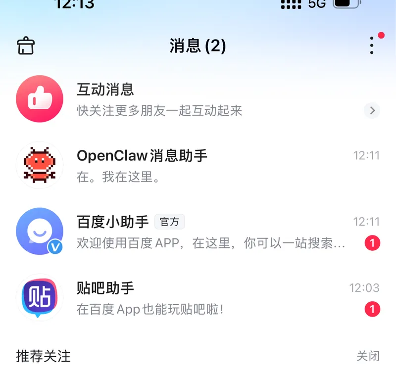 打开百度App,消息tab里多了一个「OpenClaw消息助手」。