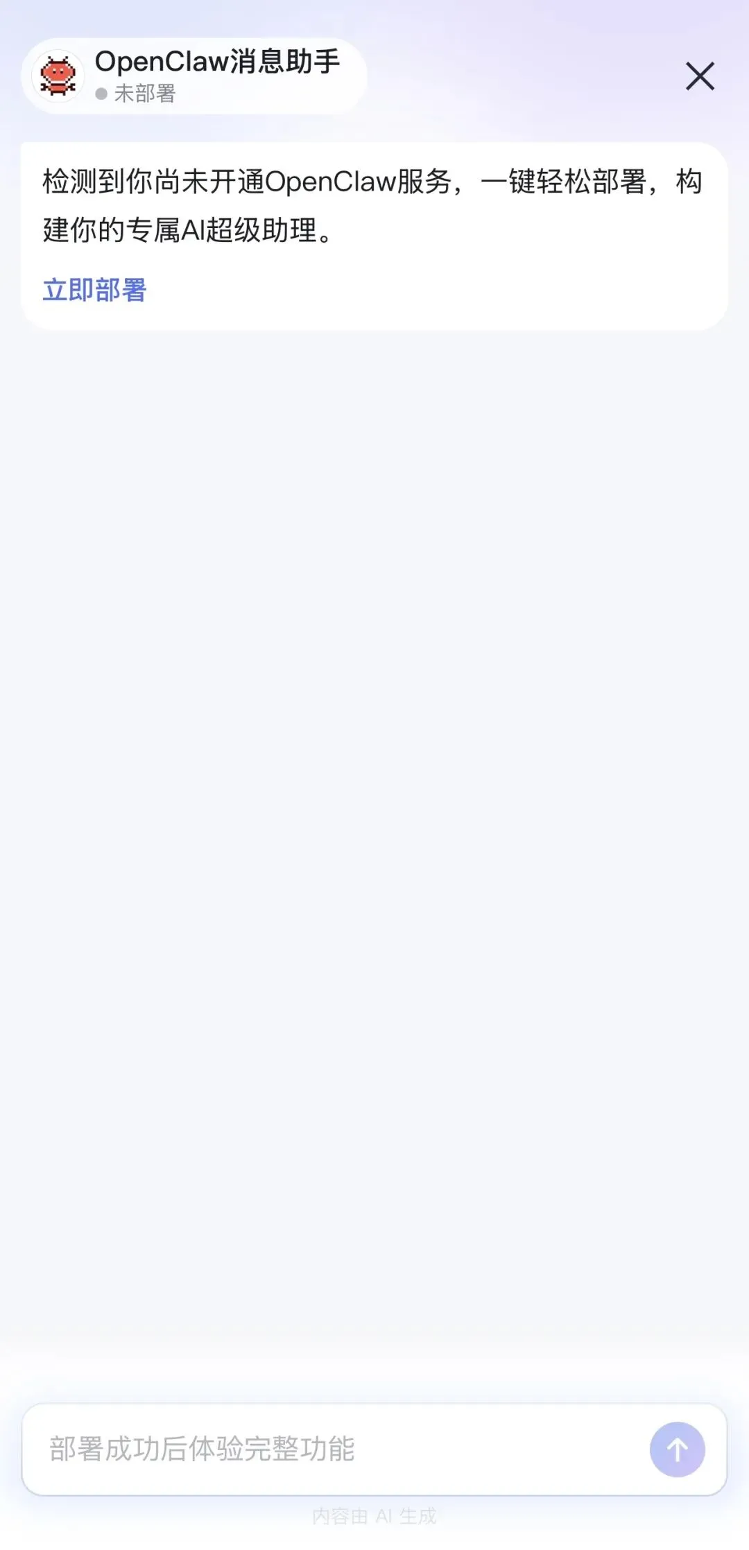 付完款等了两三分钟,收到开通成功的提示,页面上直接有一个「一键部署OpenClaw」的按钮。