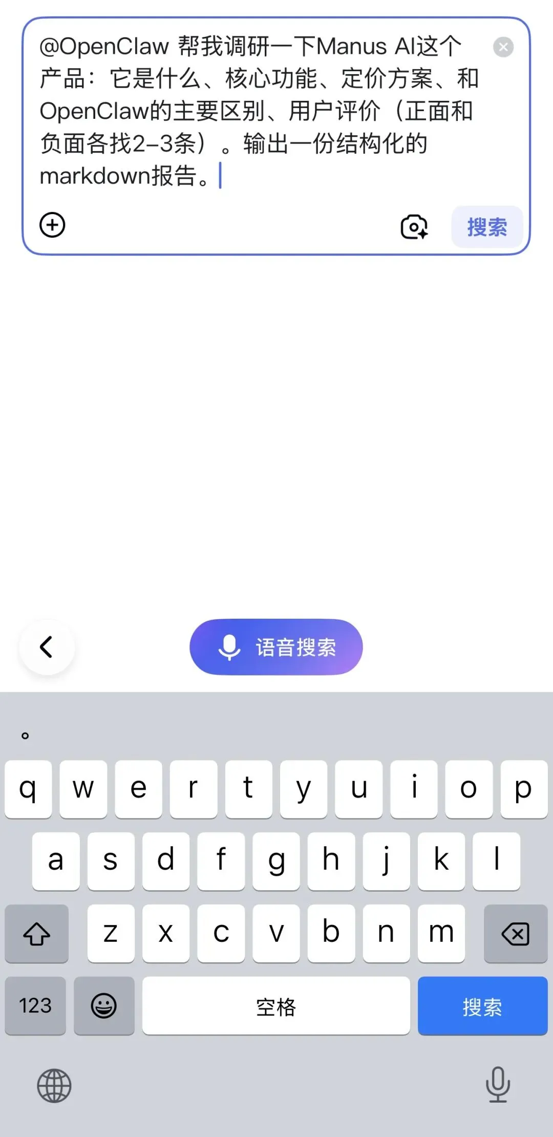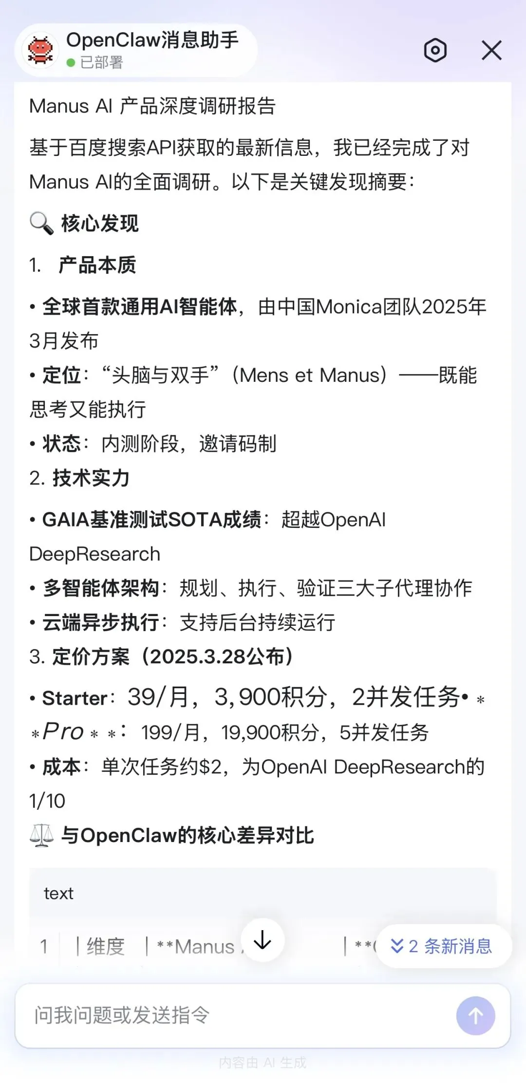 我先在搜索框里试了一下,输入一个调研任务:「帮我调研一下Manus AI这个产品:它是什么、核心功能、定价方案、和OpenClaw的主要区别、用户评价。输出一份结构化的markdown报告。」