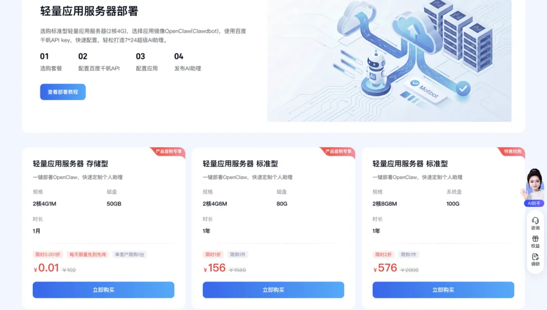 第一步,在百度智能云创建一台轻量应用服务器。镜像直接选OpenClaw,套餐选最基础的2核4G,活动价0.01元。没看错,一分钱。微信扫码付款,比买一瓶水还快。
