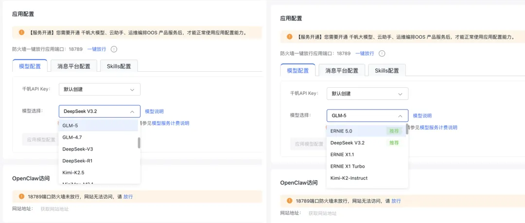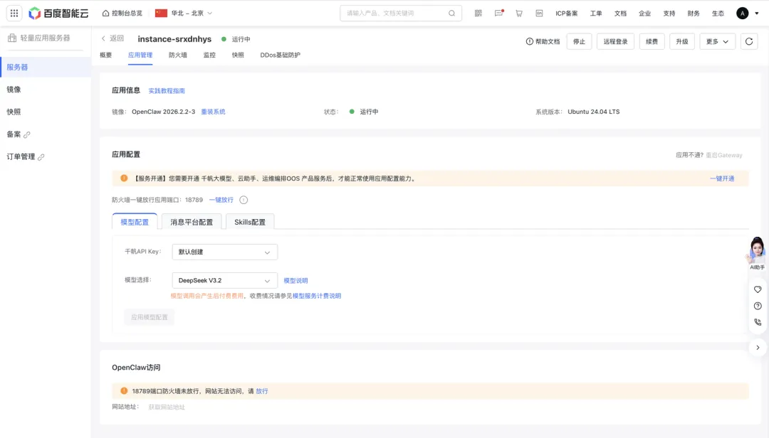 百度App的入口够轻,但如果你想把OpenClaw接到飞书、钉钉、企业微信这些工作平台,或者想自己选模型、装更多Skills,那就需要在百度智能云上走一遍完整部署。
