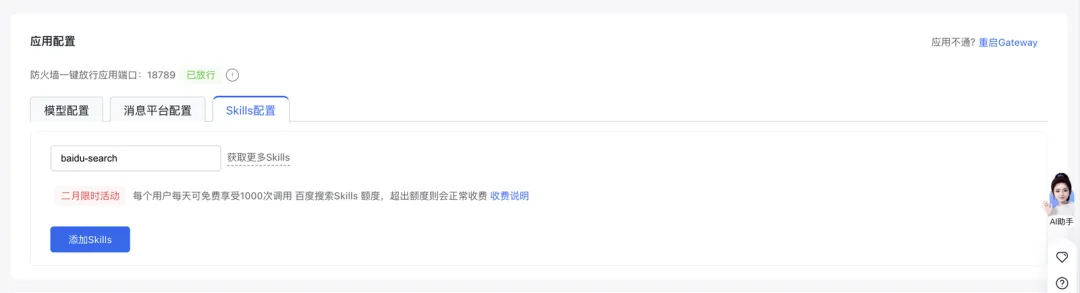 第五步,Skills配置。系统预装了baidu-search,二月限时活动每天免费1000次百度搜索调用。当然,你也可以根据自己的需要去无限添加的。